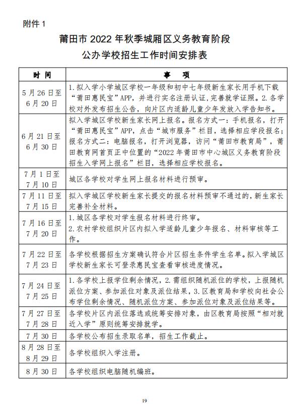 城厢区2022年秋季义务教育阶段学校招生工作方案