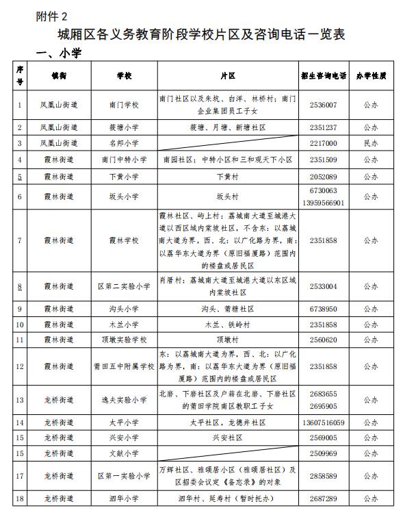 详见《城厢区各义务教育阶段学校片区及咨询电话一览表》(附件2)。