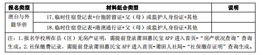 注:1.报名学校所在县(区)无房产证明,需提前登录莆田惠民宝APP进入首页-“房产状况查询”查询生成。2.社保缴费记录,需提前登录莆田惠民宝APP进入首页-莆田人社局-“社保缴存证明”查询生成。