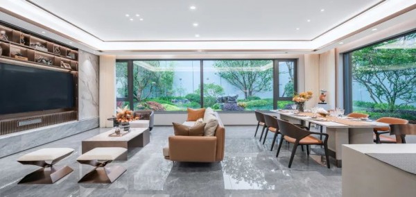 格调背景搭配 美学方显审美 犒赏视觉审美的格调设计,客厅电视机背景墙面采用天然纹理岩板与金属封边优雅混搭,勾勒大方品位,经典气质。 ✦体验馆意境图 致敬莆阳城市热土之上的高奢生活范本,由外而内迭代人居封面,进阶上品人生,与时代人物雅望一座城市的璀璨。 融创建发|天际,仅106席次的高奢圈层社交场,限量争藏中!