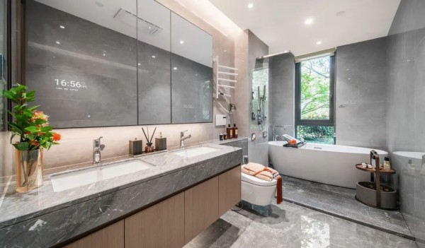 卫浴奢华设计 度假式新风尚 复刻酒店式卫浴精髓,选用防雾镜、加热毛巾架、智能马桶、魔镜、智能按摩淋浴装置,兼具美学与实用,更有浴缸观影场景营造,给予度假式灵感卫浴体验,舒展身心。 ✦体验馆意境图