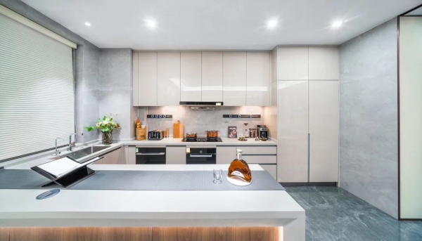此外,装修标准无一例外都是高配,比如配备了中央空调系统,品牌厨电配置,油烟机、燃气灶、洗碗机,水槽龙头等,全屋还采用射灯照明,地面灰色瓷砖通铺,赋予产品新的定义和“精装”。