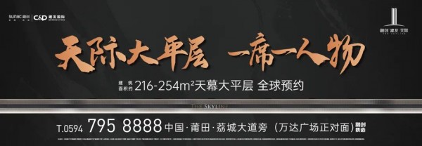 效果图 同步国际前沿的大平层,是凌云财富顶峰的人生犒赏,是落席精神世界的身份坐标。环顾莆阳城芯,时代大人物所追寻的宽奢大平层却相对难寻,若想拥有一席囊括臻稀性与圈层力的天际大平层更是凤毛麟角。庆幸的是,鼎立莆阳万达芯的融创建发|天际,成为大人物争相潮往所在。 融创建发|天际,于时代的厚积之地、十年东拓南进下的万达板块,屹立一座国际化的封面作品——约120米天际高度珍罕大平层,106席高定藏品礼献莆阳大人物。 商业、人文、交通、生态,四大资源核芯,呈现精粹生活。正对万达广场,融汇世界奢尚新潮生活;老牌教育资源莆田一中、莆田五中环绕,书香学府;填补莆田轻轨空白的F2万达广场站(规划中),极速出行速享繁华;南湖公园、木兰溪等生态景观,近享鲜氧生活。 航拍实景图 谨此丰饶资源呈献,圈定一方高净值人群对繁华生活的向往。重要的是,融创建发|天际更是当前城厢区万达板块上惟一在售的超200㎡以上大平层产品,仅不到2%的藏品级大平层,珍贵鼎阶圈层“入场券”,生活自此划界。 建筑的高度或可被超越,惟有圈层的高度才经得起岁月的淬炼。 对于上层精英而言,房子不仅是住所,更是无形的生活圈层和社交圈层的象征。精致的生活方式是他们关注的焦点,志趣相投的圈层更是他们共鸣的源点。 图片来源于网络 融创建发|天际,当下齐聚商业巨擘、政界精英、电商新秀、医药世家、珠宝巨头、红木泰斗、产业大亨7大行业翘楚。 一席一人物,具有相同的审美共识与一致认可,居于此,不再仅仅是居住,更是身份标识的象征。同时,融创建发|天际悉心打造“天际荟106”,是搭建圈层活动增进业主彼此沟通的重要桥梁。 作为莆阳封面奢居,在居住体验方面,融创建发|天际深研高阶圈层需求,在产品打造上,不讲求毫无意义的“摆阔”,而是恰到好处的“排场”。 气派归家 臻装奢阔大堂 高定人居的归家礼仪,从入门那一刻即开启。精装入户大堂,营造尊贵的归家体验,让归家的每一步,彰显气度非凡。 效果图 尊崇私享 约15.4㎡独立电梯厅 约15.4㎡的独立电梯前厅设计,可延展私属外玄关,一梯一户私享空间,专属尊崇的出行礼遇。 体验馆意境图 奢侈高度 约3.4米罕见层高 以高端奢居尺度,营造更加朗阔的居住空间,莆田市面罕见约3.4米层高,高出普通层高约60cm,从容气度彰显,自此高人一等。 体验馆意境图 超阔视野 270°全面屏采光 采用全面屏空间设计,打造270°采光面,制造更鲜亮的居家日常,营造通透舒心的生活场域,为居家场景增加更多明媚的阳光与心动的风景。 体验馆意境图 幸福聚场 约40㎡LDK大横厅 引入莆田首创LDK设计理念,约40㎡社交会客厅、约7.9m奢阔横厅,更宽敞的开放式空间,承载更多的生活场景,气派会客、家庭聚会等,随时满足日常所需,容纳无限乐趣。 体验馆意境图 妥帖设计 智能化家居系统 全屋家居智能系统,智能灯光控制、智能窗帘控制、智能空调控制、一键回家及离家模式,全屋6大空间,30+人性化细节,让居家更有“智慧”。 体验馆意境图 高定服务 莆田首栋专属双会所 私享豪华双会所,奢配建发物业金砖级礼遇,定制金钥匙管家服务。会所配置私宴厅、茶室、棋牌室、台球室等;屋顶设有莆田罕有的露天酒吧、屋顶花园,礼遇圈层高阶品味。 效果图 融创建发|天际,不止是纯粹的建筑,更是鼎配资源、纯粹圈层、奢居空间的定制,真正堪称经典大平层作品,惟有阅遍世界的时代大人物,当知超然胸怀。一席一人物,建筑面积约216-254㎡天幕大平层,全球预约,惟此珍藏!