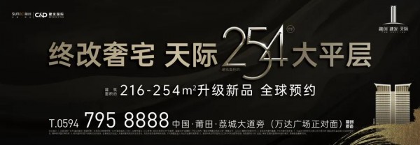 时代的更迭,带来城市焕新巨变,而城市也以齐平世界的地标建筑回敬时代。 ✦项目效果图 融创&建发房产以引领城市人居未来发展的姿态躬身耕耘莆阳,钜献一座约120米凌空高度天际作品,耸立城芯。基于对莆阳高净值人群居住需求的深入洞察,融创&建发房产2022战略升级作品——天际254,全新登场,划定莆阳终极改善人居标准。 根据福布斯资料显示,福布斯近年来曾评选出的“世界十大奢宅”中,大平层产品一度占据七席。 ✦图片来源于网络 从纽约曼哈顿的“中央公园西15号”到英国女王的邻居“海德公园1号”,从上海的汤臣一品到香港的天玺,平层大宅已然成为全球居住风潮,彰显着其背后鼎豪人物的不凡身份与地位。 著名经济学家薛兆丰曾言:“稀缺是这个世界的基本事实。” 回瞰莆阳楼市版图,“大平层选择太少,核芯板块更是一席难求”等一系列问题,成为当下莆阳富豪的置业痛点。数据显示,城厢核芯区在售建筑面积约200㎡以上大平层产品仅占约1%,而在十年城势东拓南进诞生的万达板块,建筑面积约200㎡以上大平层产品仅融创建发|天际可选,106席臻稀难再。(数据来源:克而瑞) ✦航拍实景图 拥有一席高端平层大宅,已然成了高净值圈层的特别谈资。一切属于莆阳鼎豪的价值标签,皆指向了融创建发|天际,于此城市矜贵土地之上,将一座城市的优质资源配套悉数尽藏,融汇一处真正纯粹的圈层住区。 深刻洞察莆阳高净值人群对改善生活的渴求,天际254从居住面积、生活空间以及独特设计3大维度演进,界定终改居住形态与标准。 超乎想象的“王者级”建筑面积约254㎡超大面积,为成长型家庭提供完美解决方案。从幸福三口之家,到三代同堂乃至三胎时代,一步到位满足家庭的“全生命周期”更迭。 ✦体验馆意境图 天际254三大Life Plus Zone定制化空间:儿童房(Fun Plus)、茶室(Talk Plus)、鞋帽间(Beauty Plus),可根据家庭结构变化的居住所需自由改变。奢而不侈,华而有实,让“自我需求”的实用主义融入精奢生活之中。 居家空间,本身即是一处生活的舞台。天际254,注重秩序新生的场域平权,既享受独立的同时又满足集体的居住舒适度。 ✦体验馆意境图 户型设计满足峯层社交会客、家人好友聚餐、儿童娱乐玩耍、个人静谧独处等多种功能,实现居住者具有集体感,又有各自自由的独立空间,互不干扰,各有所乐。如男主人在茶室会客,女主人可与闺蜜在餐厅聚餐,孩子在客厅玩耍,父母在房间休息。 真正的改善,看的是每一处生活细节的品质升华。一梯一户尊崇归家礼仪,堪比“1个私人影院包间”的约15.4㎡独立电梯厅,彰显家族门楣风范。 ✦体验馆意境图 莆田首个LDK设计约40㎡大通厅,约7.9米奢阔大面宽客厅,演绎创新社交型生活;罕见约3.4米层高,足足高出普通住宅层高约60cm,品质生活高人一等;270°环幕视野,33%窗地比,超9.5米三面观景尺度,极目远眺,奢享全面屏观景体验。 ✦体验馆意境图 作为莆阳真正匹配高净值圈层居住眼光的大平层奢居,融创建发|天际,让所享超越所想,让所鉴超越所见。建筑面积约216-254㎡终改奢宅,全球预约。