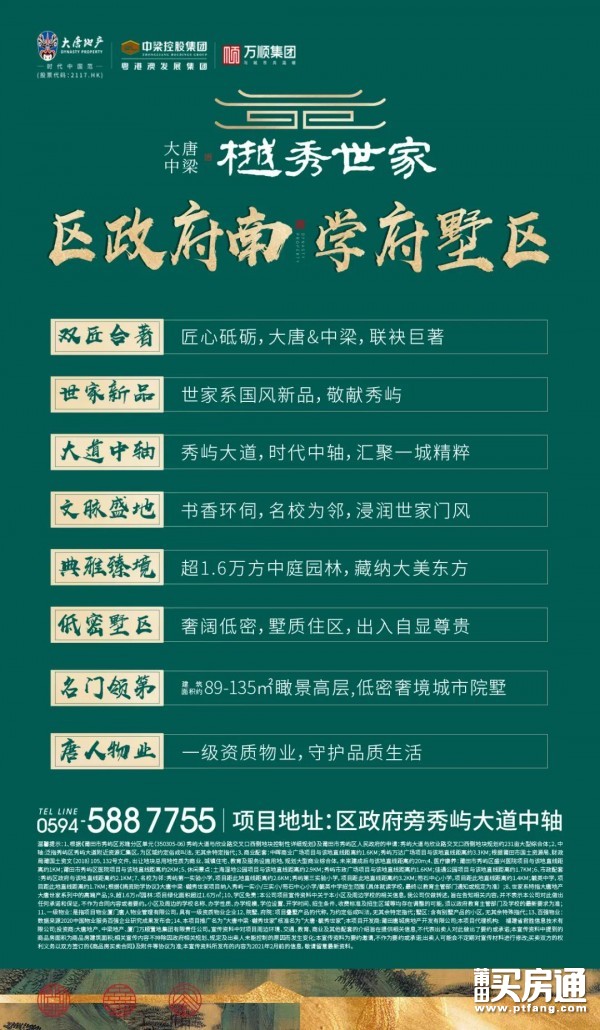 温馨提示:1、铜锣湾广场:根据《莆田市秀屿区苏塘分区单元(350305-06)秀屿大道与欣业路交叉口西侧地块控制性详细规划》及莆田市秀屿区人民政府的申请:秀屿大道与欣业路交叉口西侧地块规划约231亩大型综合体,2月3日,香港铜锣湾成功竞得约231亩综合体地块;根据莆田市国土资源局、财政局莆国土资文〔2018〕105、132号文件,出让地块总用地性质为商业、城镇住宅、教育及服务设施用地,规划大型综合体,未来建成后与该地直线距离约20m;2、学府:秀屿第一实验小学,项目距此地直线距离约2.6KM;秀屿第三实验小学,项目距此地直线距离约3.2KM;笏石中心小学,项目距此地直线距离约1.4KM;毓英中学,项目距此地直线距离约1.7KM;3、根据《捐资助学协议》,大唐中梁·樾秀世家项目纳入秀屿一实小/三实小/笏石中心小学招生范围,捐资方所开发建设的位于秀屿区笏石镇莆田PS拍-2020-26地块的住宅购房户直系子女,可凭购房合同备案证明、购房合同和购房首付款发票(查原件,收复印件)初中七年级直接就读毓英中学(注:初中七年级在毓英中学每年安排1个班的就读名额,对于当年购房户直系子女生源超额部分,则按城区购房户子女入学办法安排入学);本公司项目宣传资料中关于本小区及周边学校的相关信息,我公司仅做转述,旨在告知相关内容,并不表示本公司对此做出任何承诺和保证,不作为合同内容或者要约。小区及周边的学校名称、办学性质、办学规模、学位设置、开学时间、招生条件、收费标准及招生区域等均存在调整的可能,须以政府教育主管部门及学校的最新要求为准;4、中轴:泛指秀屿区秀屿大道附近资源汇集区,为区域约定俗成叫法,无其余特定指代;5、市政配套:秀屿区政府与该地直线距离约1.9KM;6、府院、院墅:指项目叠墅产品的代称,为约定俗成叫法,无其余特殊指代;瞰景:指高层住宅可俯瞰园林、小区内景,无其余特殊解释;7、商业配套:中晖商业广场项目与该地直线距离约1.6KM;8、休闲景点:秀屿市政广场项目与该地直线距离约1.6KM;土海湿地公园项目与该地直线距离约2.9KM;9、金砖国家领导人会晤提供商:金砖厦门会晤四大中心为金砖国家领导人厦门会晤注册中心、工商论坛注册中心、媒体取证中心、工商论坛注册中心、媒体取证中心、制证中心,大唐地产系媒体取证中心服务供应商。10、本项目推广名为“大唐中梁·樾秀世家”核准名为“大唐·毓秀世家”;本项目开发商:莆田唐城房地产开发有限公司;本项目代理机构: 福建省君胜信息技术有限公司;宣传资料中对项目周边环境、交通、教育、商业及其他配套的介绍旨在提供相关信息,不代表出卖人对此做出了要约或承诺;本宣传资料中提到的商品房面积为商品房建筑面积;相关宣传内容不排除因政府相关规划、规定及出卖人未能控制的原因而发生变化;本宣传资料为要约邀请,不作为要约或承诺;出卖人可能会不定期对宣传材料进行修改;买卖双方的权利义务以双方签订的《商品房买卖合同》及附件等协议为准;本宣传资料所发布的内容为2021年3月前的信息,敬请留意最新资料。预售证号:(2021)莆房许字第12号。