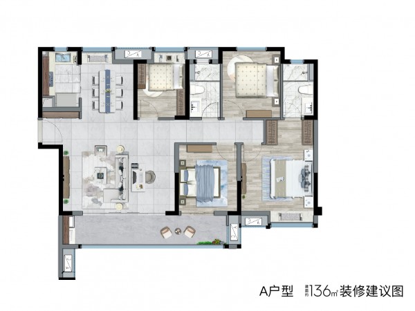 建面约136㎡户型,三开间朝南,共四房,南向景观大阳台+北向飘窗,屋内南北对流,空间敞亮,将采光做到了极致。