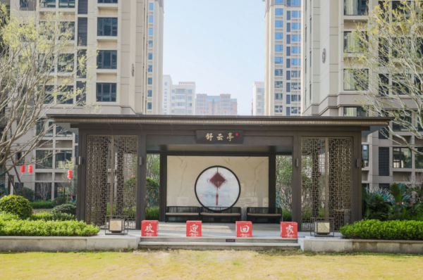 二面:出云楼阁,通过主入口,即是中轴景观区,这段业主们回家的必经之路左右两侧为景观喷泉,潺潺流水配上新中式景墙,别具意境。