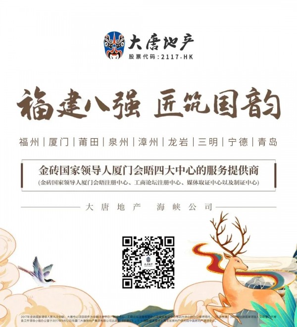 八强数据来源于亿翰智库。2017年金砖国家领导人第九次会晤,大唐中心项目部作为会晤注册中心、制证中心、工商论坛注册报到中心及媒体取证中心等四大中心的办公接待场所。(信息来源:2017年金砖国家领导人会晤厦门市筹备工作领导小组办公室于2017年9月12日向厦门大唐房地产集团有限公司出具的《感谢信》)。